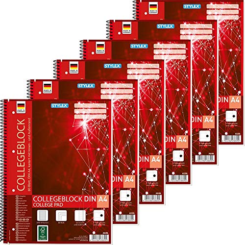The Stylex spiral notepad has the format DIN A4, squared. With 80 sheets of wood free white 60gsm paper. Perforated with rim. With 4 holes for filing in folders. A separate sheet corresponds to DIN A4. Set of 6 college pads, made in Germany.